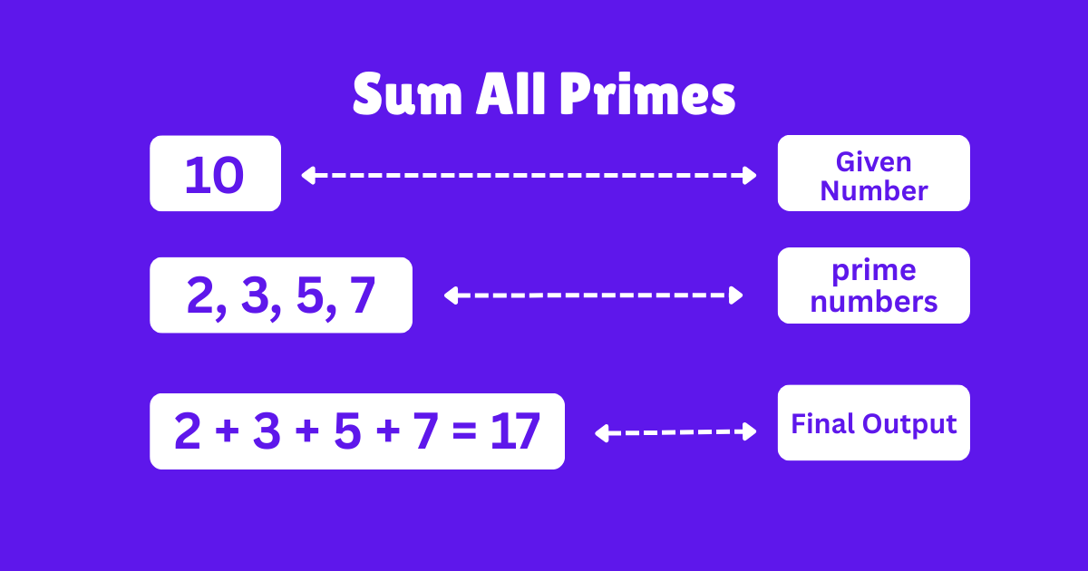 Sum All Primes is a coding challenge in which we have to find the sum of all prime numbers up to a given number. We’ll be given a number, such as 10, and first need to find all the prime numbers up to that number. Then, to get the final output, we need to sum all the prime numbers that we found in the first step.